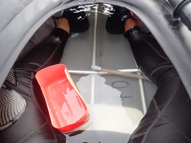 ビルジ(アカ・船内に溜まった水)が動くからか?と掌で排水したが、本当なら排水用のビルジポンプを常備しておくべき。