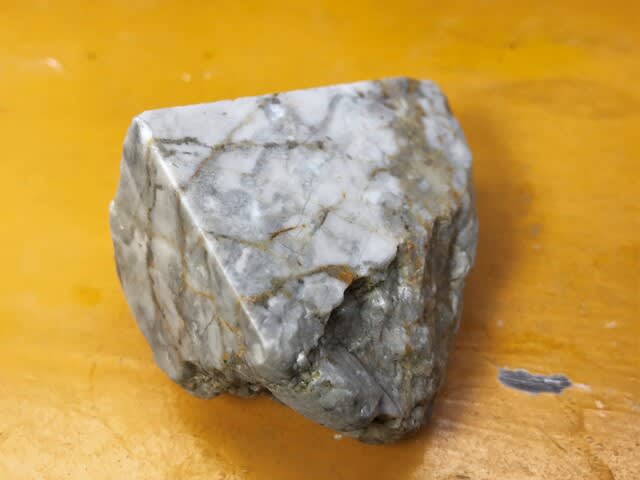 これは石灰岩。直前まで実物の色合いに似た石灰岩を使おうと思っていたのだが、試みに研磨したら貝の化石が出てきたり、色味は茶系だしクラックが多すぎてあかんかった。