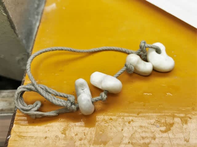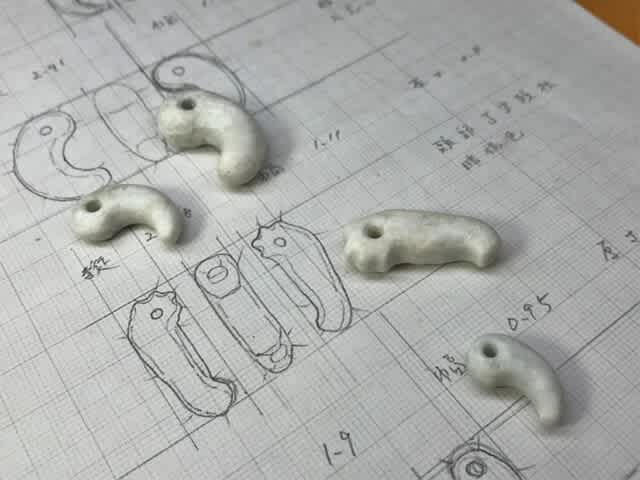 そこでロディン岩が再浮上した。勾玉に成形してバレル研磨機でエイジング加工したらいい感じ。きちんと実測図通りに作っておりますヨ。