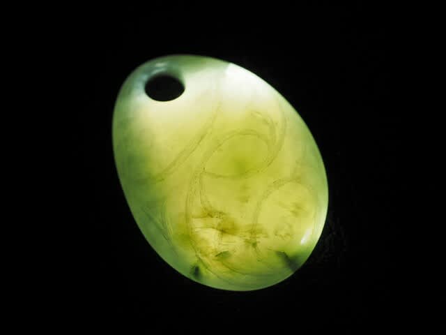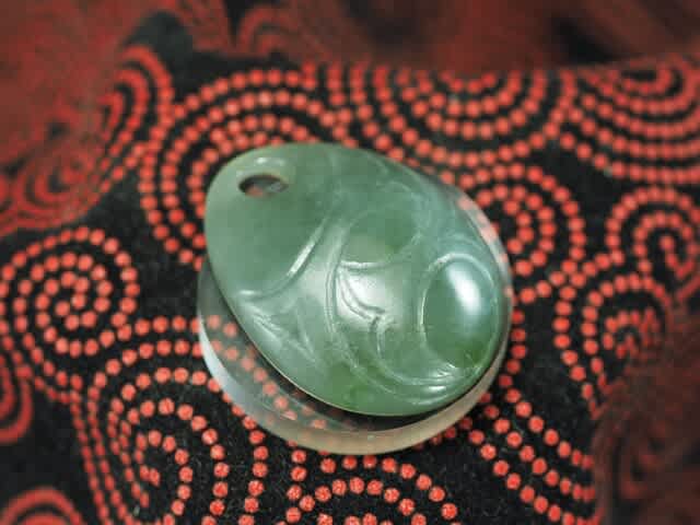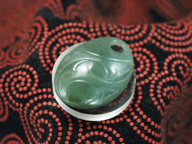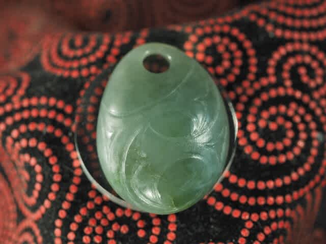 作品の出来具合より、硬玉ヒスイか否か、あるいは硬玉ヒスイであっても原石の質が評価されているのが現状なのだ。それにしても半透明な石材に線刻した作品の写真撮影は、映り込みや反射があって難しい。負け惜しみのようだけど肉眼だとけっこう綺麗なのです(笑)