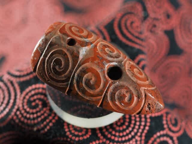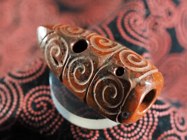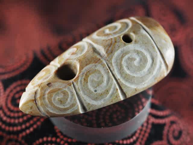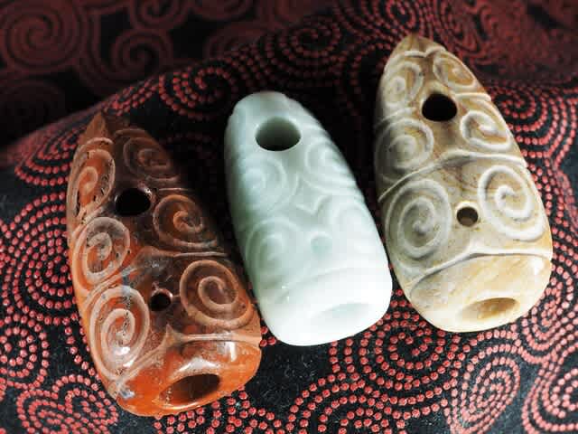 また瑪瑙化した部分が空洞になっていたり、部分的に泥のように柔らかかったりと均質さがない鉱物なので、勾玉より縄文テイストの石笛やペンダントの方が向いているようだ。