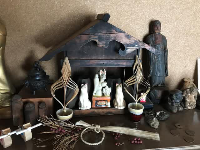 神棚の中と左に八角形のコケシのような木製品が並んでいて、遊びにきた地元の人に聞いたら、上田市にある信濃国分寺の護符「蘇民将来符」なのだとか。