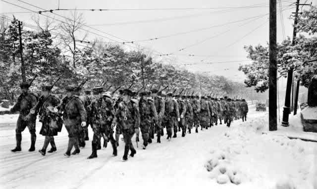 行進する二・二六事件の将兵。反乱軍の中に後に落語界初の人間国宝になった前座時代の柳家小さんが二等兵として混じっていて、演習と聞かされて出動したのにいつの間にか天皇の鎮圧命により賊軍となったことが解り、部隊は兵舎で意気消沈・・・上官からみんなを笑わせろと命じられて落語を一席うかがったが、誰もクスリとも笑わねぇ・・・と弟子に語っていたそうだ。