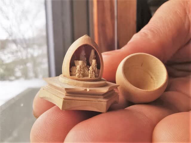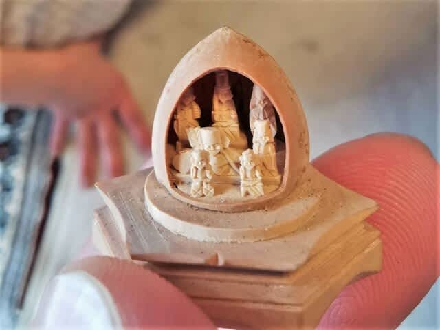 銀杏の殻を真似たらしい大きい方は七福神。前列に籾殻に入っている大黒天と恵比寿と同じものが並んでいるので、同一人物の作品であるのだろう。