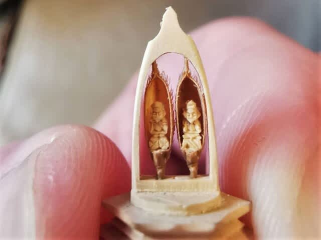高さ3㎜ほどの超小型の仏像?と思いきや、よくよく観察すると籾殻を光背に見立てた2体は、左側が米俵に座っているので大黒天、右側が頭巾の形から恵比寿であるらしいと視認できた。