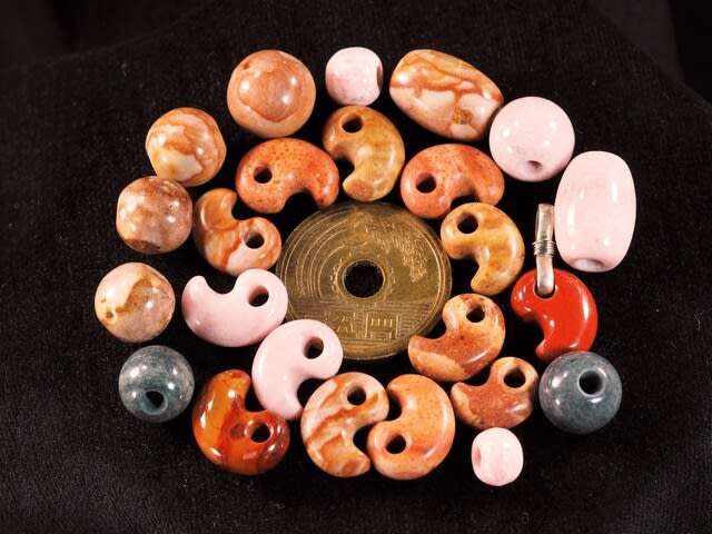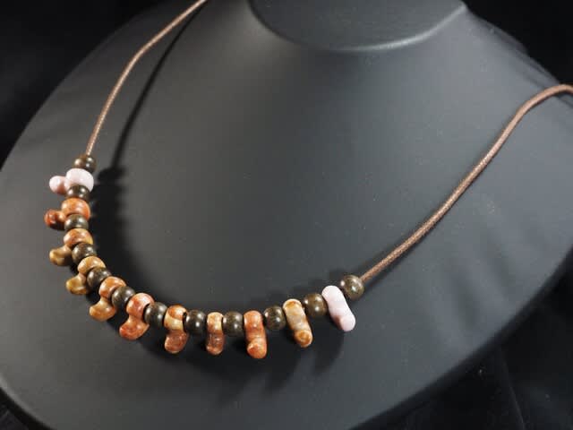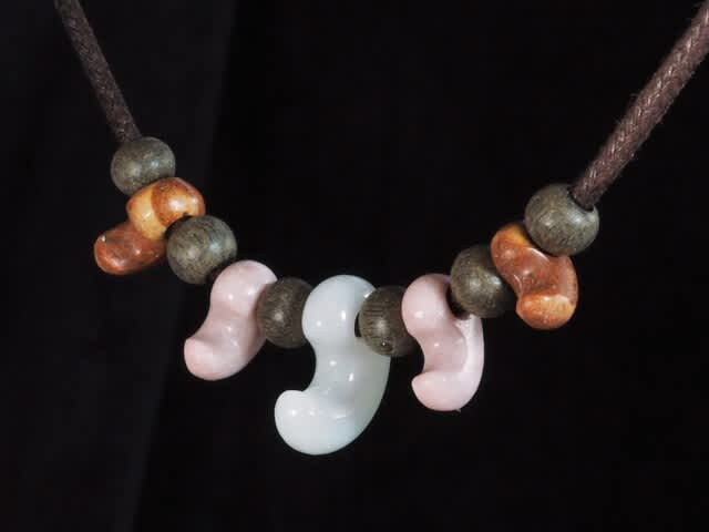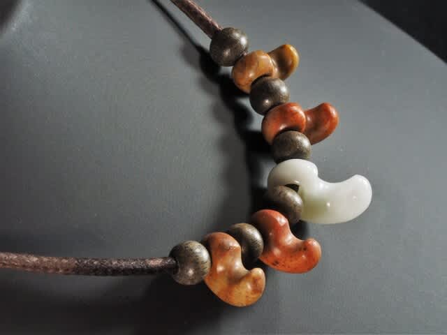 すでに弥生時代は超小型の勾玉が存在していたし、古墳時代の「巫女形埴輪」が勾玉と丸玉を連ねた首飾りをしているから、この試みは勾玉の原点回を指向した復古調首飾りなのだ。