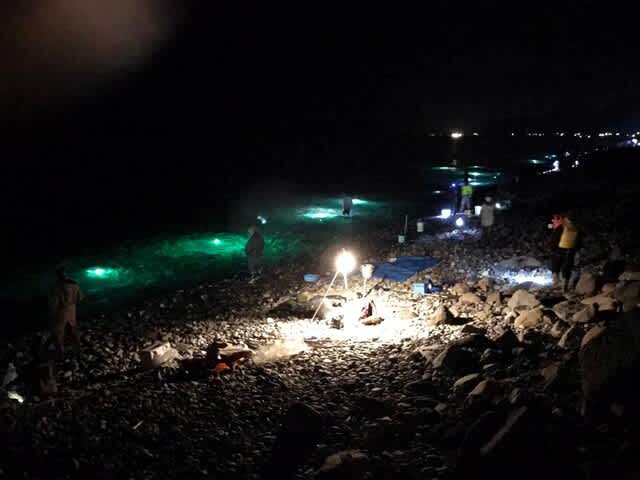 ホタルイカを掬いに浜に降りたら、深夜なのに多くの人。発電機の音や集魚灯の灯りもあって、なにかの祭りのようだ。