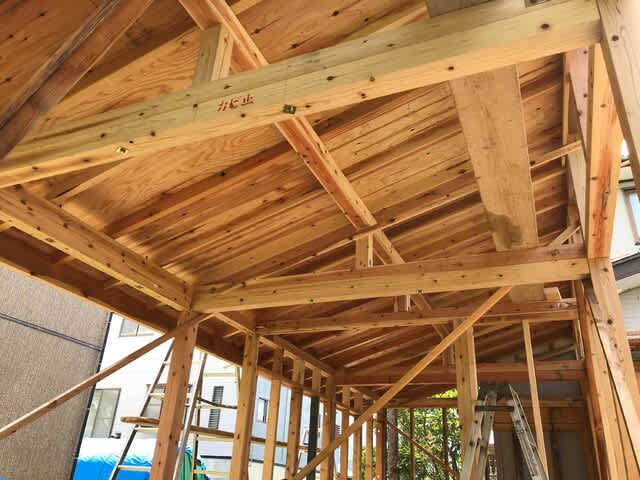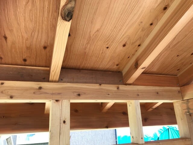 ところが今回は中川親方に桁と垂木をやってもらったので、同じ寸法に切りそろえた埋木がスパスパと収まっていくではないか。前回の時はホームセンター購入のツーバイ材を使ったが、今回は地元の製材所「ランバー羽入」さんの屋根垂木を使ったこともある。