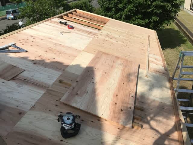屋根下地ベニアをひとりで屋根にあげるたび、ビス固定するたびに一歩づつ完成に近づいていく。