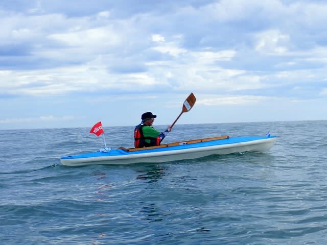 参加艇のなかに、相当に古いフジタカヌーのファルトボート(折畳み式カヤック)に乗った男性がいて、並走してカヌー談義をした。