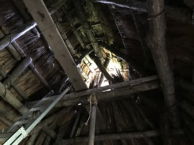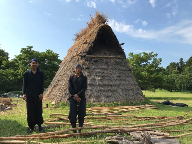 信州の友人、茅葺職人の渡辺拓也さんが、長者ヶ原遺跡の竪穴住居の修復に来ている。