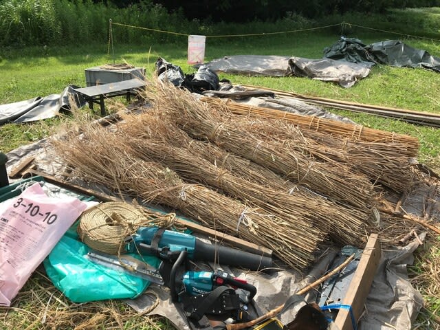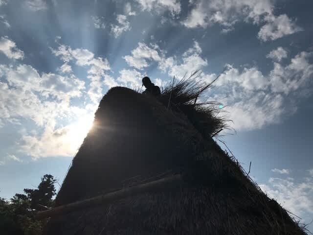 滅多に見られない茅葺職人の技、今日が最終日である。タイミングよく今日は遺跡で縄文体験会があるので、子供たちに究極のSDGs建材、茅を触ってもらおうではないか。