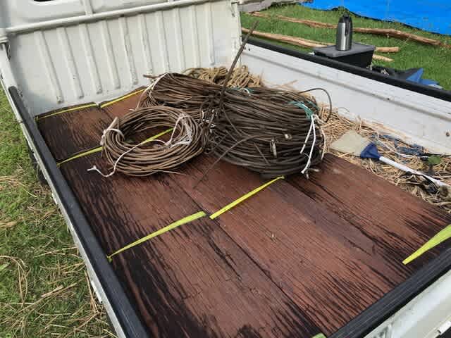 棟部分にかぶせる杉の樹皮と結束用の藤蔓