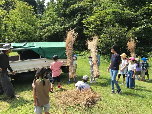 長者ヶ原遺跡に集まったワラシたちを、茅葺職人の渡辺さんの現場に連れていった。好漢渡辺さんは、わざわざトラックから茅束を出して子供に持たせてくれた。