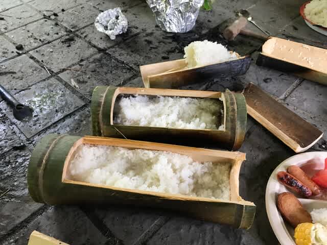 竹筒ごはんがひどいメッコ飯に炊きあがったので、スタッフのご婦人たちに聞いたら、事前に米を吸水していないばかりか、普段から炊飯器の早焚き機能で炊いているので、米を吸水させることを知らないと聞いて、お互いに驚く。
