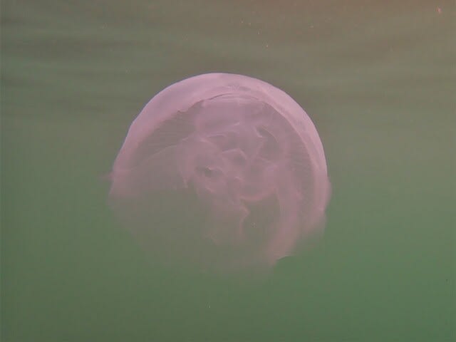 海面を漂うクラゲが、夕映えでピンクに染まる時がある。