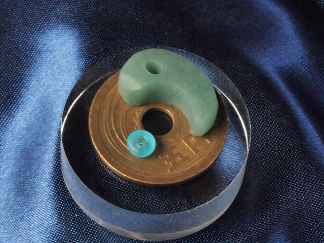 笛吹田遺跡の中央部に位置する拙宅出土の勾玉とガラスビーズの写真を見せたら、食い入るように観察されて、特に専門がガラス製品とのことで「カリガラス製ではないだろうか?」との見解。