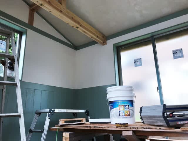 天井に塗った珪藻土含有率80%の製品は製造中止になっているので、予算さえ許せば自然素材のDIY壁材の草分けで、珪藻土含有率60%のサメジマの「珪藻土リターナブル」を推薦しますわ。