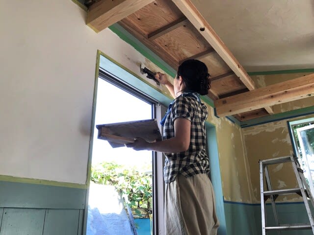 上京直前に、DIY希望者の体験を兼ねてギャラリーの壁塗りを終えておいたが、予算の都合で壁は珪藻土ではなく、半額くらいの化石サンゴ由来の壁材を選定。