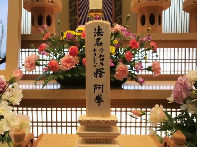 釋は釈尊の弟子という意味、拳という漢字には一生懸命という意味、阿は阿弥陀如来の阿であると同時に手放すという意味があるとの説明をして頂いて、親父にピッタリな法名だと一同納得。