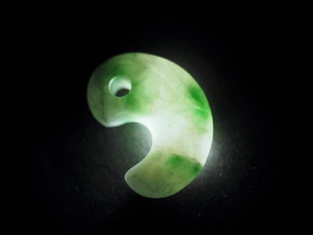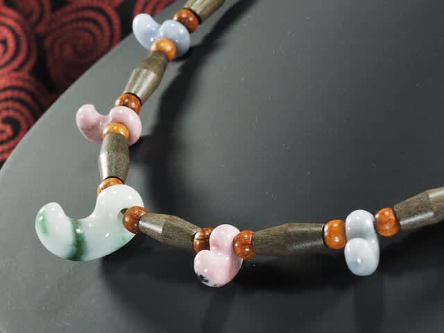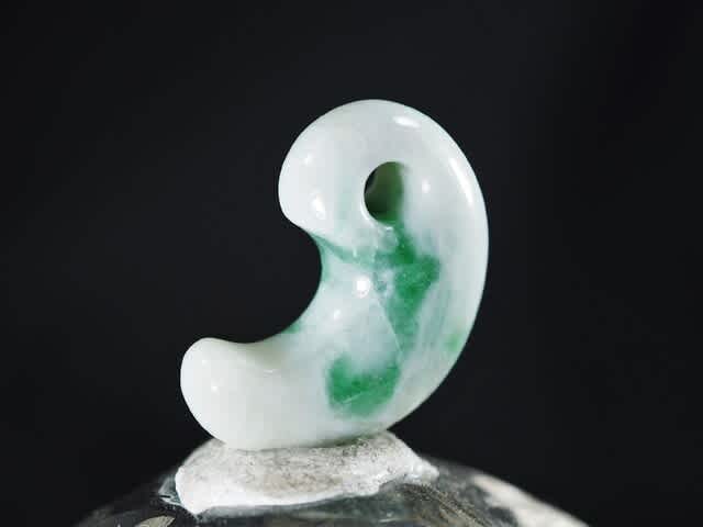 中期の大珠のようにでかいとそれほどでもないが、勾玉のように小さく、より立体的な装身具だと、白地に黄緑がより映えるように思う。大珠はある意味で平面的で、勾玉こそ白地に黄緑の模様がはいったヒスイの魅力を引き出すに、最も適切な立体造形物だと思うのが、ぬなかわヒスイ工房の考え方