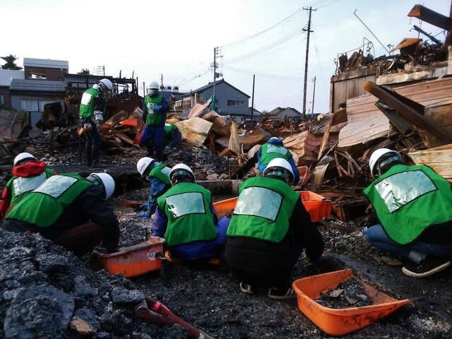 焼け跡から貴重品や思い出の品を掘り出すボランティアである。