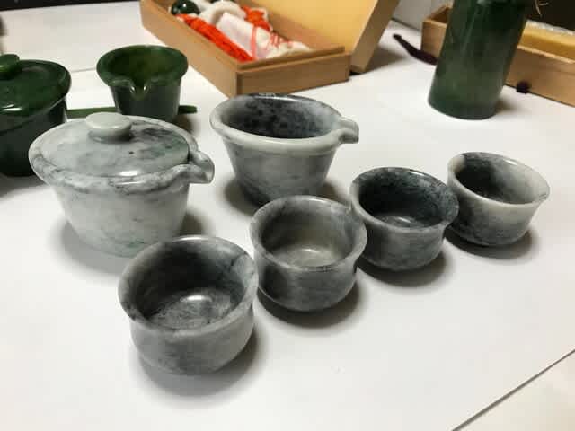 硬玉ヒスイ製の玉露用急須と茶碗のセット。技術のことは抜きにして、お茶道具としては深緑のネフライトの方が落ち着きがよく、「なんだ軟玉ヒスイなの!硬玉ヒスイより安いんでしょ?」とバカにしてはいけないという教訓。