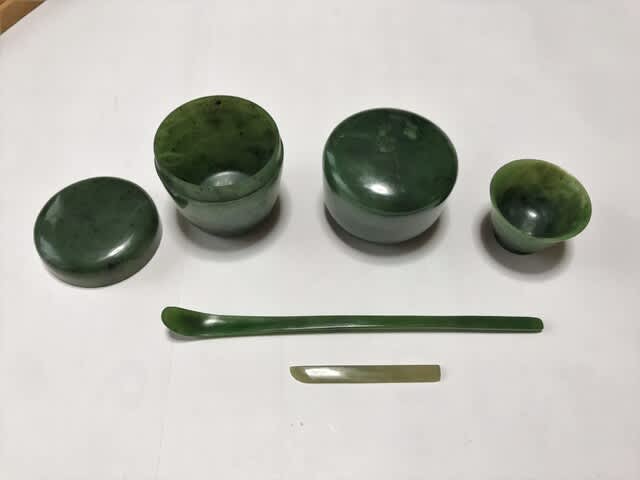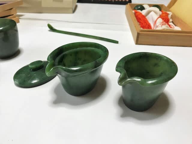 ヒスイ加工の大先輩が若い頃につくったネフライト(軟玉ヒスイ)のお茶道具を見せてもらったが、文化財級の姿に感動。