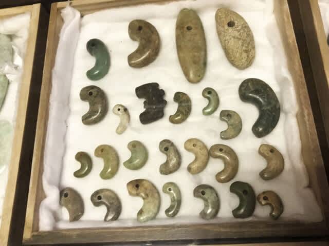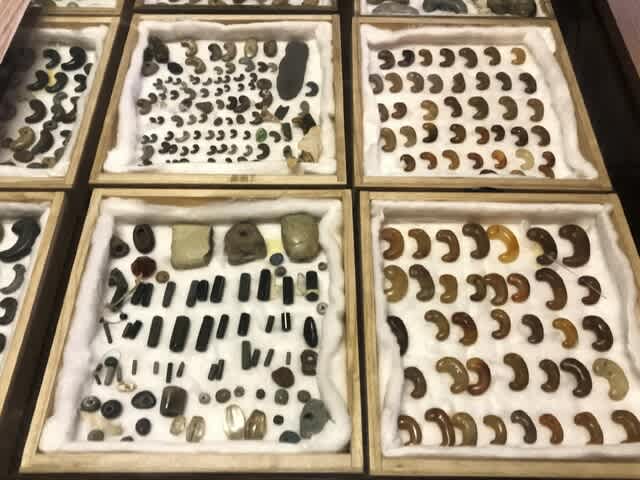 ヒスイの勾玉は左端上の緑色の定形勾玉は北部九州系の弥生時代の伝世品、他は北陸東部系の古墳時代前期~中期のものが多いようだ。
