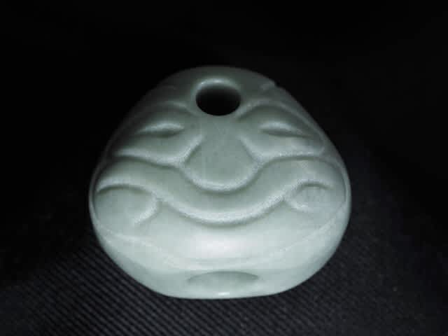 額の孔はペンダント仕様の孔だけど紐をはずすと吹くことができ、量産品の石笛よりいい音がする。