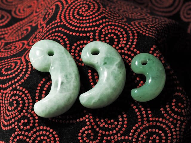 右端はわたしの定番デザイン勾玉(縦27㎜)で、サイズ比較に並べると小さくみえるが、現代の勾玉にしたら大型の部類だ。