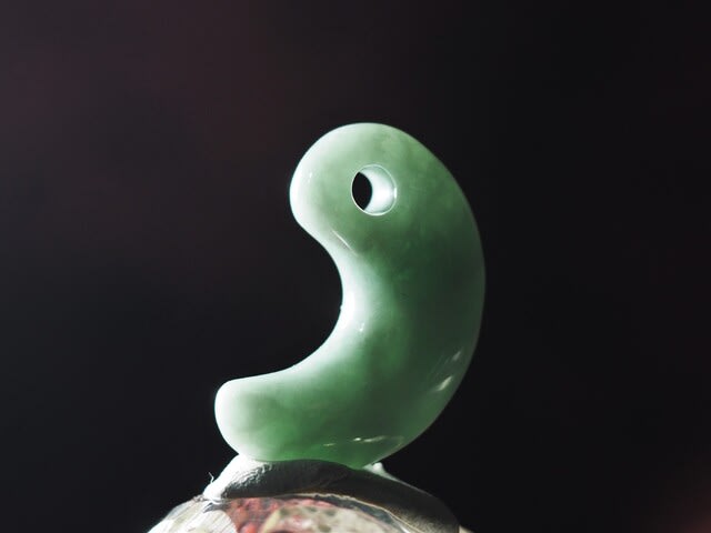 その点、真名井勾玉の系統は造形も研磨も難しいものではないが、その特徴の無さが僅かな差で美醜の分かれ目になる点では難しい立体造形だ。実物の紐孔は5㎜もあるので魚や蛇などの生き物の眼を思わせるが、訳あって4㎜にしてあるので、ちょっと印象は違う。