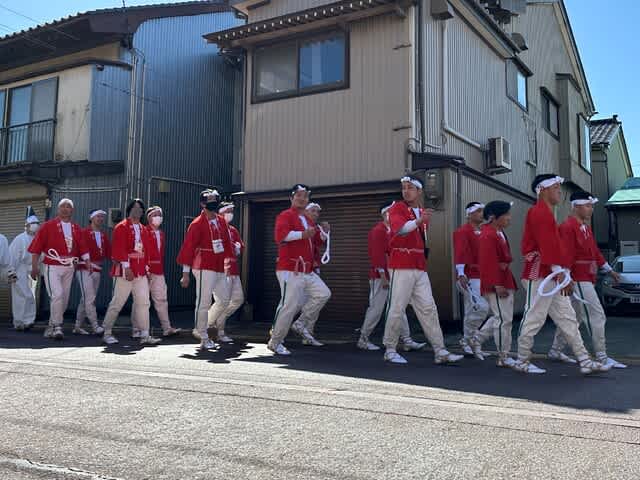 手引き(てひき)は、輪っかにした晒し木綿で手を繋ぎ合い、神輿を引っ張って走らせる原動力で、立候補した屈強の11名。