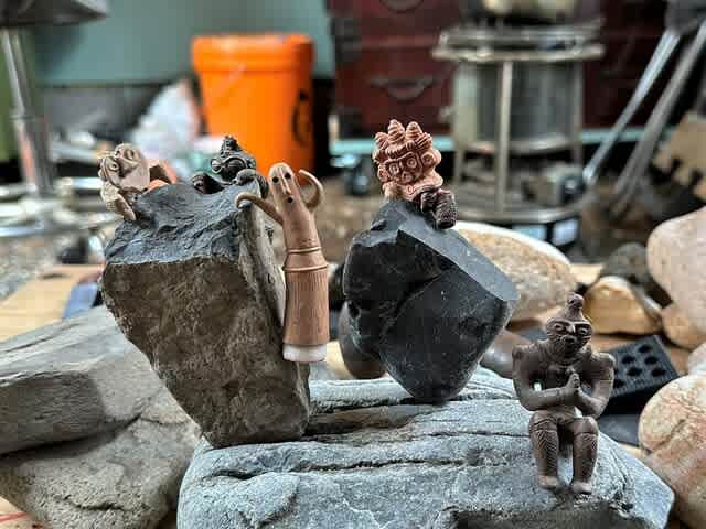 ザラザラして凸凹の多いメノウ・安山岩・流紋岩・砂岩を土台にして、断口面(節理でスパッと割れた面)のある石を土台の凹みに縦置きにするのは難しくない。そこに土偶ガチャを引っかけるくらいなら、はじめての子供でも楽しめるに違いない・・・かなぁ(笑)