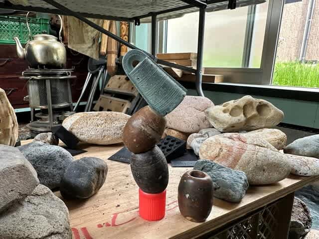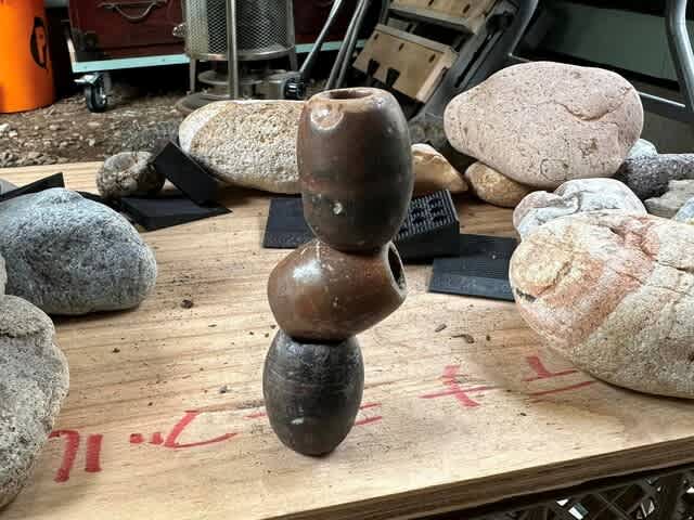 茶色い筒状の物体は海岸でひろった昔の漁網の重りで、陶器製のオーバル形状だからツルツル滑る。