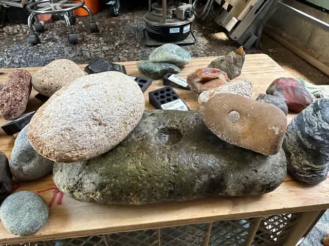 「くぼみ石」は木の実を割るための固定具、「穴あき石」は石笛や安産・多産のお守りなどであったなどが考えられると考古学や民俗学的な説明をした。