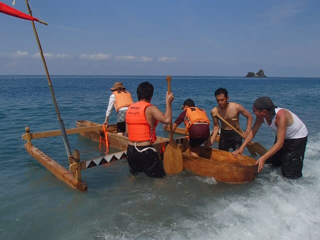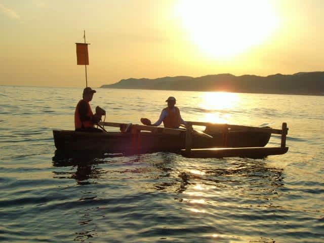 ねじり曲がった丸太でつくったので最大船体幅が60㎝強しかいが、ダブルアウトリガーをつけているので安定性はバツグンだ。