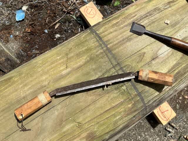 普通の人はセンなんて知らないだろうが、細長い片刃の両端の柄を握って、樹皮を剝いたり、材を均一に削ったりできる古い木工具で、趣味の木工でも重宝する。
