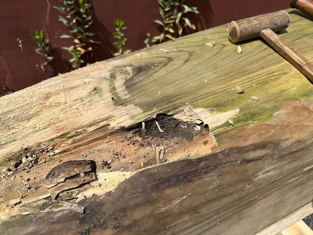 爪がはいるくらいに腐った部分をノミで削ったら、表面から1~2センチくらいがイモムシの巣になっていて、Nさんから「はやく気付いてよかったネカ」との言葉に励まされた。