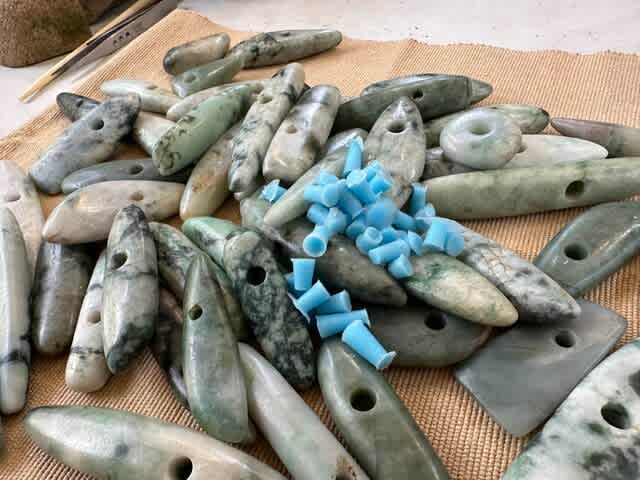 出土品と現代の作品の紐孔内部の比較をしたいと願っていたら、長野県の縄文仲間の関本さんがオークションで落札したヒスイ大珠のコレクションを大量に持参してくれた。