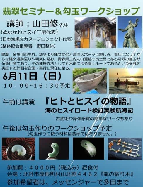 縄文ヒスイ漫談をしながら、午前中は「海のヒスイロード検証実験航海」のトーク、昼から出土品の勾玉の複製ワークショップやります。
