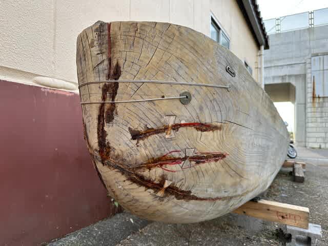 頭を悩ませていたヒビ割れ箇所の止水については、和船ならマキハダを詰めるところだが高価だから保留!インドでは解したロープと椰子の繊維を詰めて、アスファルト乳剤でコーティングしていたが臭うので却下!