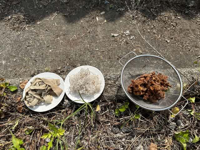 左からボロ布、解した木綿糸、ゼンマイ綿。たとえカシュー塗料の止水効果が期待できなくとも、ゼンマイ綿をみっちり詰めてあれば止水効果は高いのではないだろうか。自然素材だから海に落ちても安心だ。