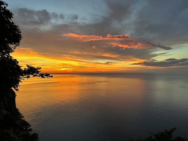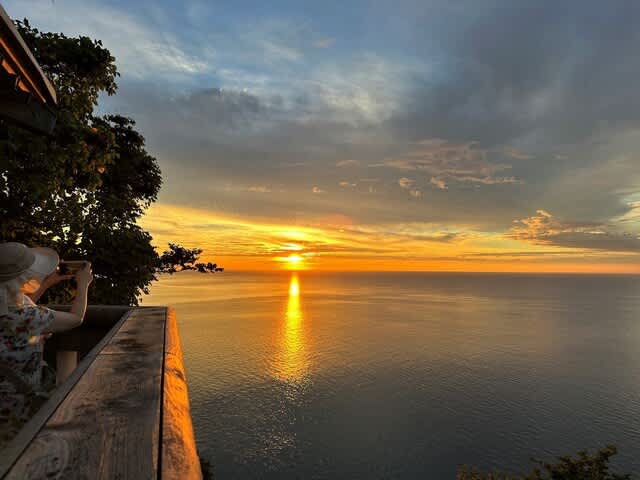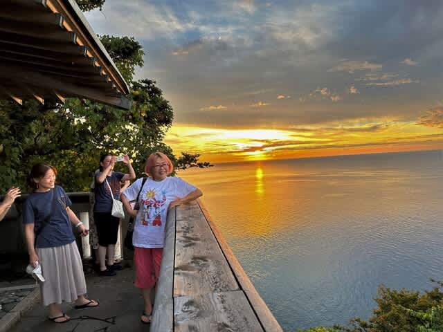 ガイドのルートによって夕焼け鑑賞のポイントは様々だが、標高90mの断崖にある親不知観光ホテル裏の展望台は絶景ポイントで、案内すると誰もが「うわぁ~!」と声をあげる。