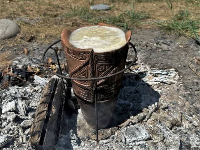④10分ほどコトコト煮込んで完成!不安定な土器なので100均で買った植木鉢スタンドで転倒防止。次回は耐火煉瓦の上に乗せようとおもう。