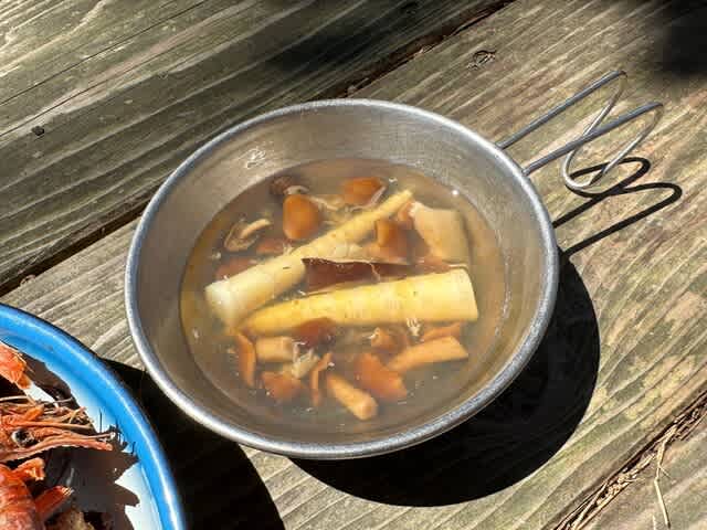 わたしは民俗例から具材は保存の意味から乾物も多用していたと考えているが、乾物はいい出汁がでるメリットがあり、薄味なのに濃厚な味わいとお代わりする人もいて、これは縄文土器料理歴20年の研究成果w