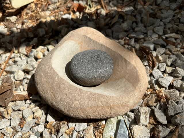 ところが体験者の多くは石皿の溝の方向とは無関係に、手にもった摺り石をこねくりまわす回転運動で粉砕するではないか・・・ムムム。