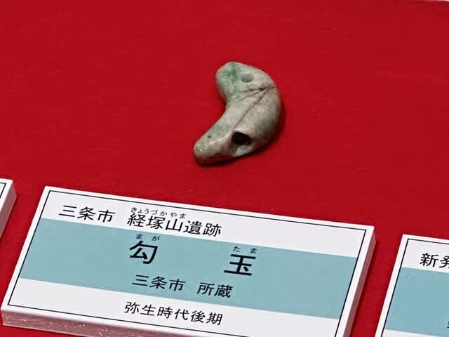 三条市の経塚山遺跡の勾玉の背部に縦方向の孔があけられた緒締型だ。冠などに差して飾ったとの説もあるが、新潟県内からも出土していたとは思わなんだ。