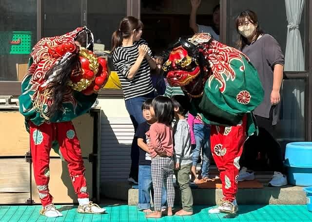 一の宮(天津神社・奴奈川神社)の秋祭りで、ジョウバ(除魔・獅子のこと)が向かいの保育園に乱入して、園児の頭をかじっていた。