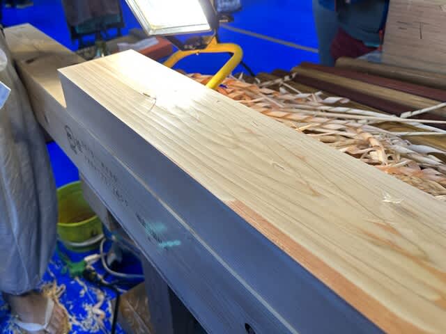宮大工から「大工さんですか?」と聞かれたので「ヒスイ職人ですぅ。古武術ならってましたぁ」と答え、疑問点をアドバイスしてもらい、前の人が凸凹につけた刃の痕を平らに均した。